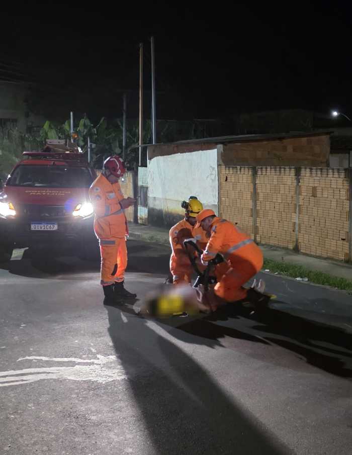 A equipe de resgate realizou atendimento pré-hospitalar imediato, utilizando campos operatórios para contenção das hemorragias. Em seguida, foi feita a imobilização completa da vítima com prancha longa e colar cervical, procedimento padrão para prevenção de possíveis lesões na coluna.