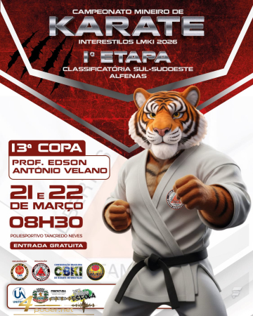 A cidade de Alfenas receberá nos dias 21 e 22 de março, a partir das 8h30, a 1ª etapa classificatória Sul-Sudoeste do Campeonato Mineiro de Karatê Interestilos LMKI 2026. O evento será realizado no Poliesportivo Tancredo Neves e contará com entrada gratuita ao público.