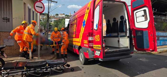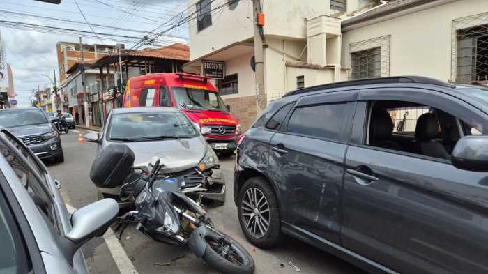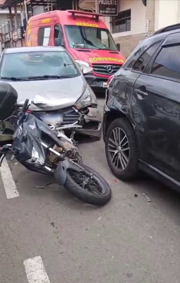 Na tarde da mesma quarta-feira (5), um acidente no centro de Alfenas envolveu três veículos — dois automóveis e uma motocicleta Honda CB 300F conduzida por uma mulher grávida. A gestante apresentava contusão na perna direita, sendo imobilizada e estabilizada pela equipe de resgate.